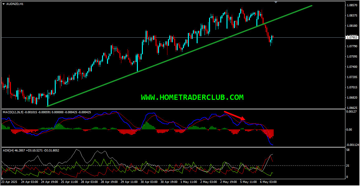 AUDNZD H1(1 Hour) Chart Analysis – Bearish Divergence, Uptrend Line Breakout, ADX Indicator