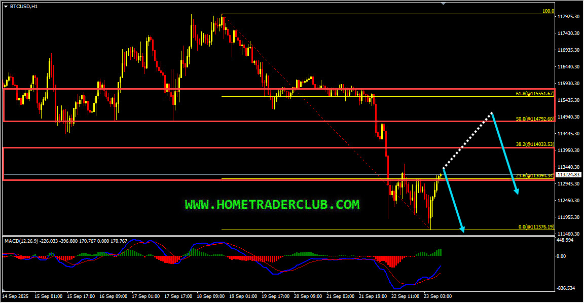 On the H1 chart, we could see that currently we have a strong bearish momentum here as well. Also while measuring this strong bearish move we have two key resistance zones that has formed. The first key resistance zone is formed based on the 23.6%(113094.34) – 38.2%(114033.53) Fibonacci retracement levels of the strong bearish move. The second key resistance zone is formed based on the 50%(114792.60) – 61.8%(115551.67) Fibonacci retracement levels of the strong bearish move. Until both these key resistance zones shown in the image below (marked in red) holds my short term view remains bearish here and I expect the price to move lower further.