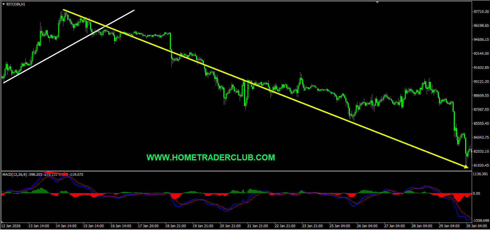 On the H1 chart, the market provided us with various facts supporting the bearish view. The price which was moving higher created a bearish divergence between the first high that has formed at 96538.01 and the second high that has formed at 97919.87 based on the MACD indicator, which we may consider as evidence of bearish pressure. The price then moved lower and broke below the most recent uptrend line. We may consider these as facts provided by the market supporting the bearish view and also there we no signs opposing this bearish view. Then as you can see in the image below how the price moved lower further and provided a fantastic move to the downside!