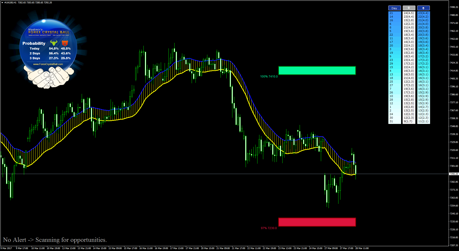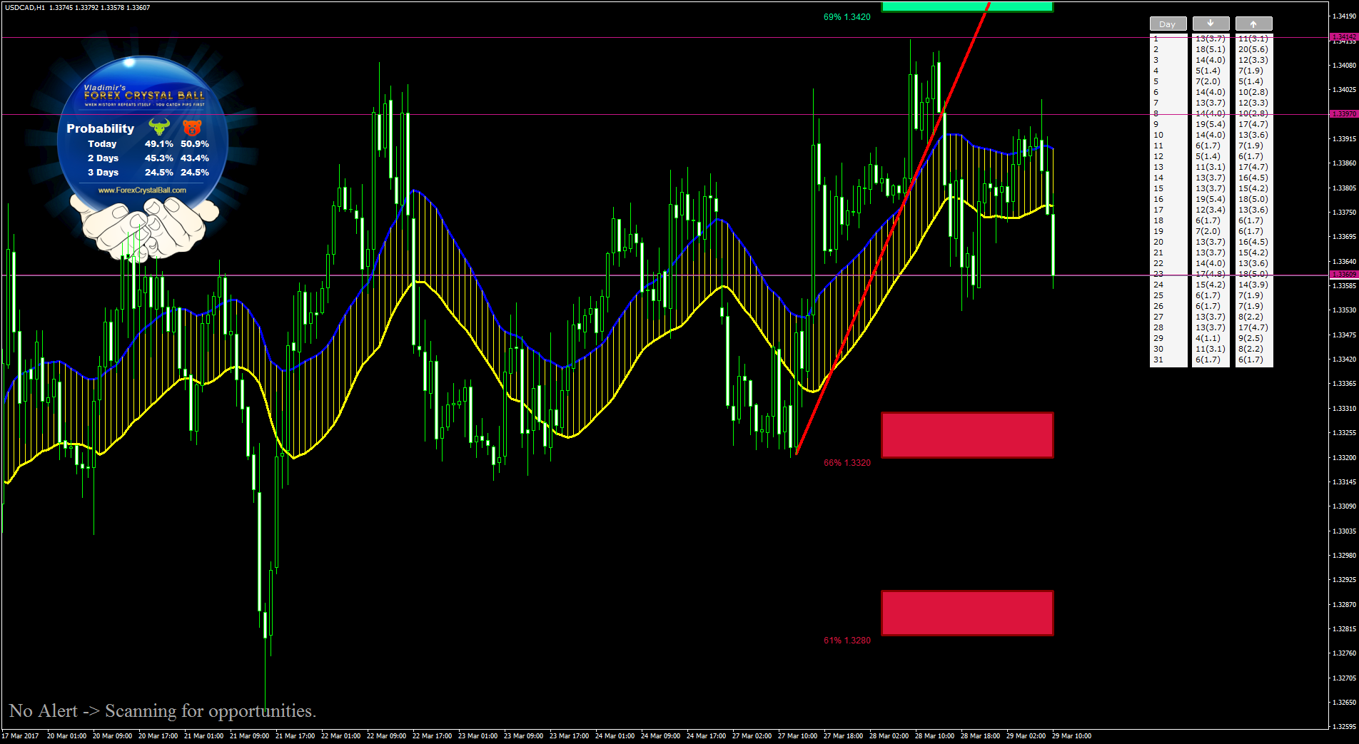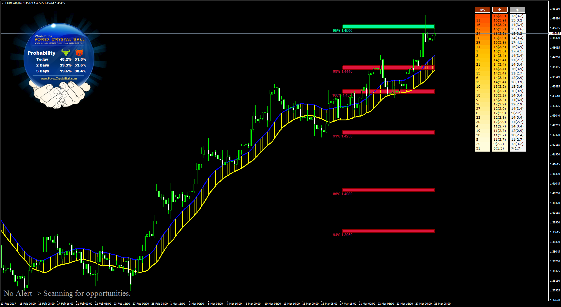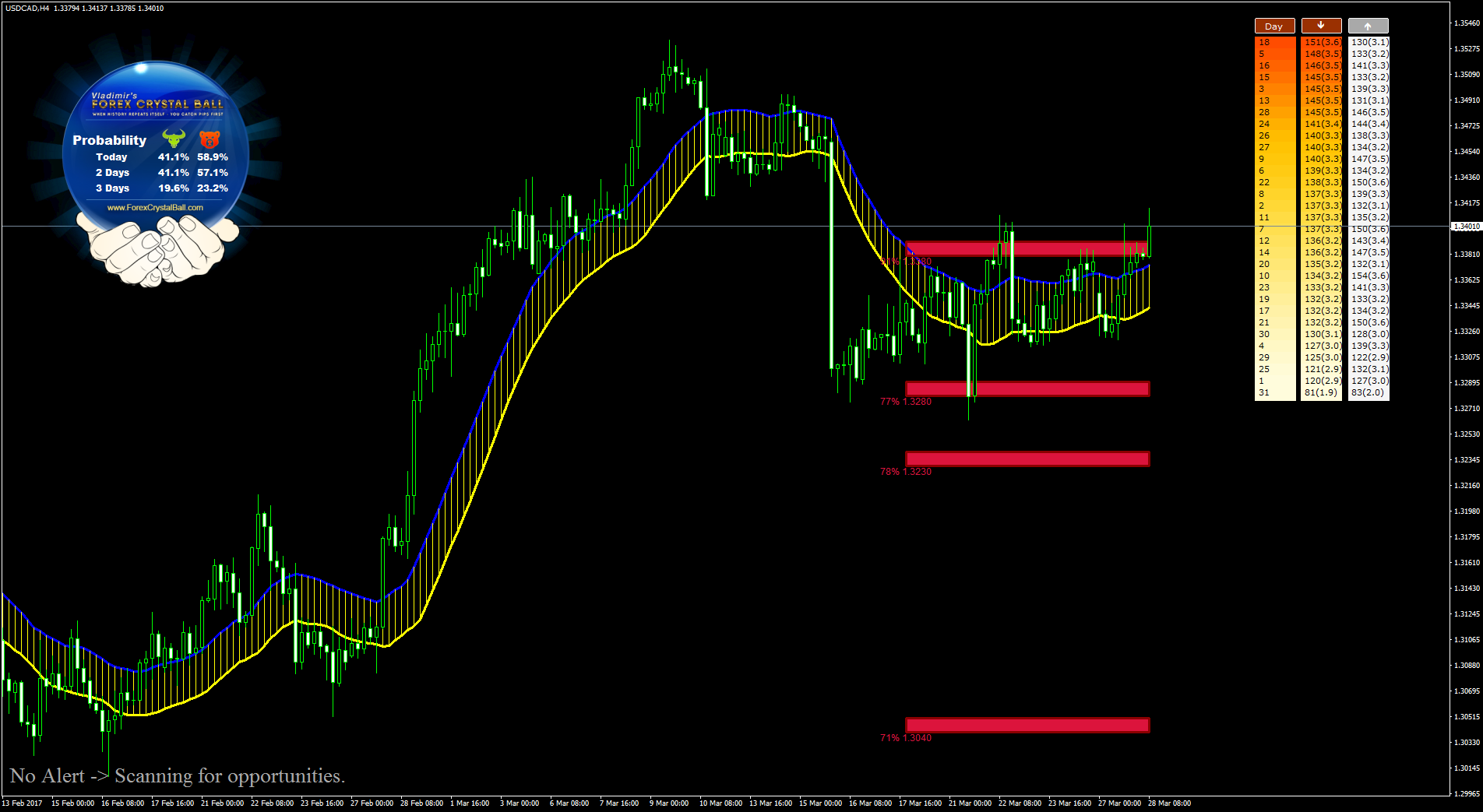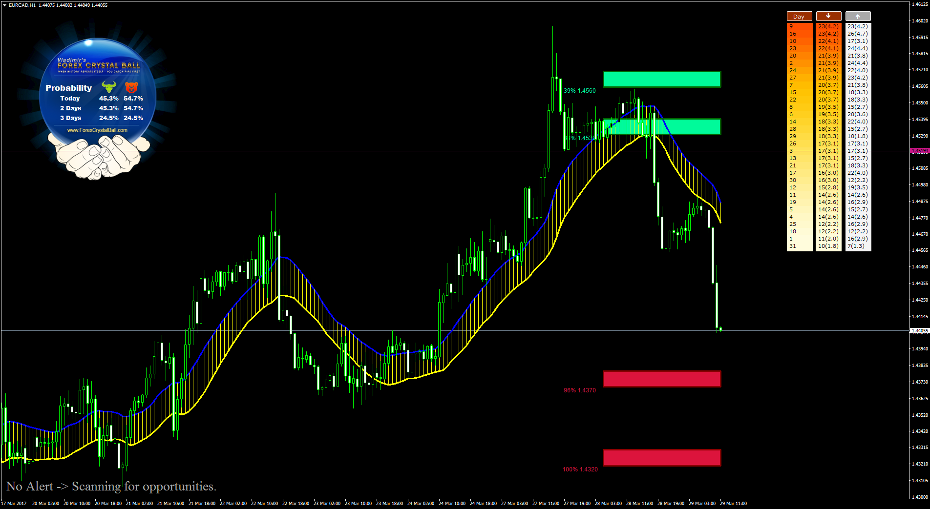 - Price is trying to break above the top red S/R zone but it gets rejected every time. This is important! Notice the huge bearish bar on the left. Even after 10 days or so, price is still far away from this bar’s high. This tells us only thing – bears are gathering up and a push down is very likely to happen. Price action 101. Combine that with the Crystal Ball probabilities and the Statistics and we have a really high probability setup forming here.