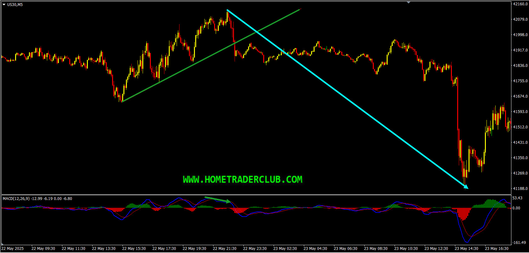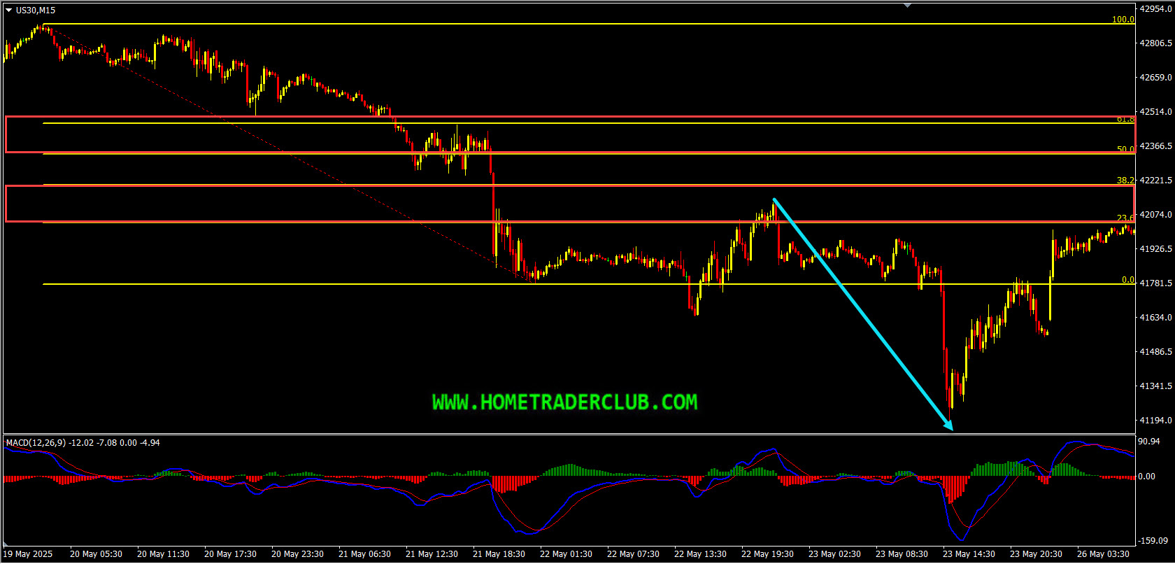 On the M5 chart, the market provided us with various facts supporting the bearish view. The price which was moving higher created a bearish divergence between the first high that has formed at 42094.7 and the second high that has formed at 42123.9 based on the MACD indicator, which we may consider as evidence of bearish pressure. The price then moved lower and broke below the most recent uptrend line. We may consider these as facts provided by the market supporting the bearish view and also there we no signs opposing this bearish view. Then as you can see in the image below how the price moved lower further and provided a wonderful move to the downside.