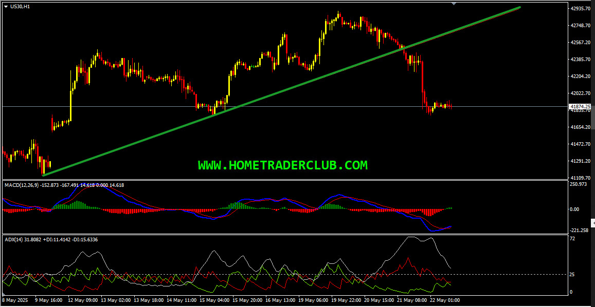 Dow Jones H1(1 Hour) Chart Analysis – Strong Bearish Momentum, Uptrend Line Breakout, ADX Indicator