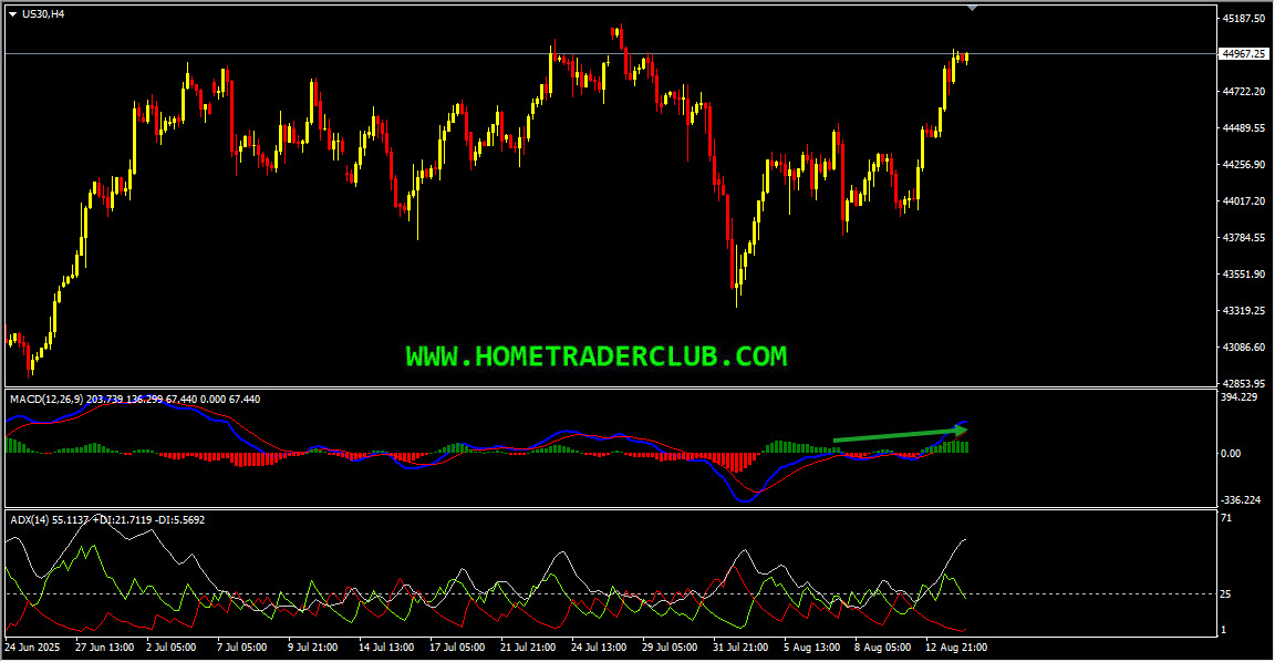 Dow Jones H4(4 Hours) Chart Analysis – Strong Bullish Momentum, Higher Highs, ADX Indicator