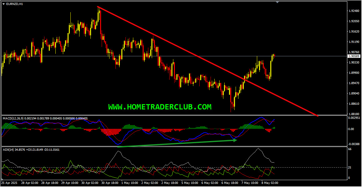 EURNZD H1(1 Hour) Chart Analysis – Bullish Divergence, Downtrend Line Breakout, ADX Indicator