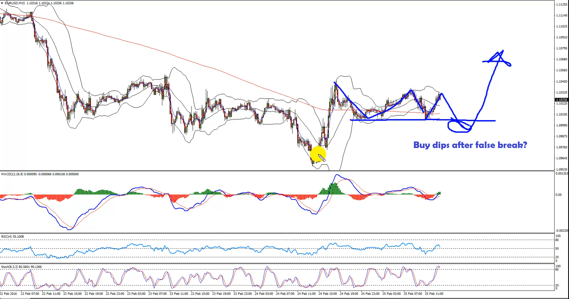 M15 – If the EURUSD pair dips from the current levels, creates a false break below the 1.1000-10 levels and trades back higher, then we can enter a buy trade.