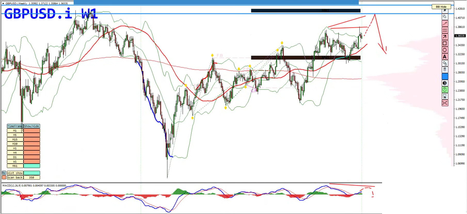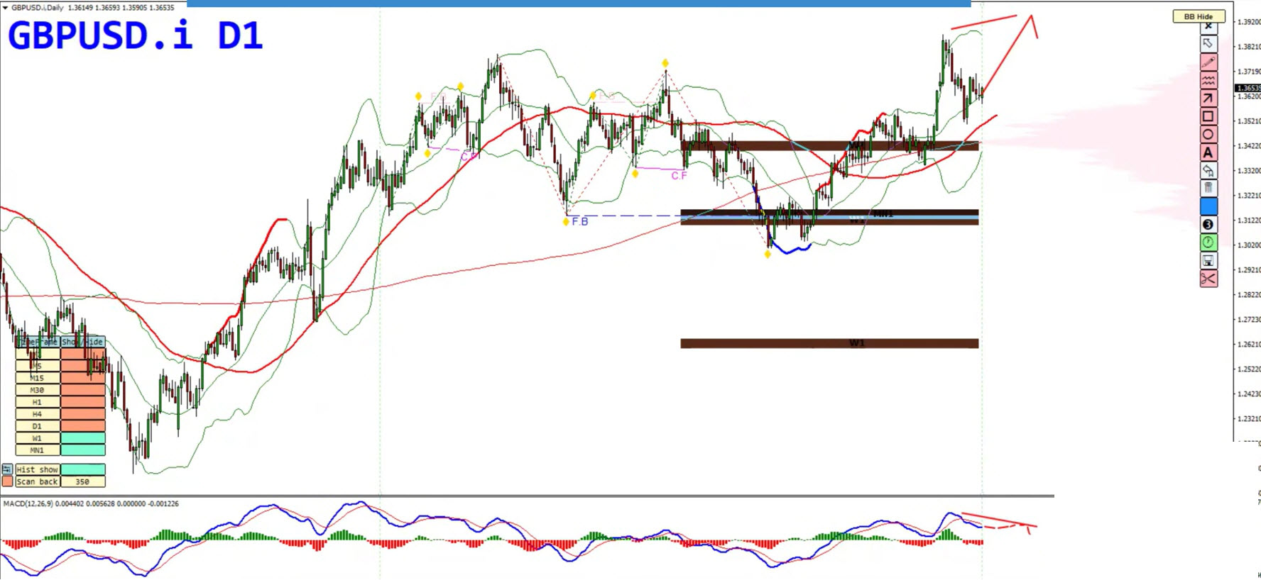 Pullbacks into resistance areas align with potential bearish hidden divergence (lower highs on price with higher highs on MACD histogram).