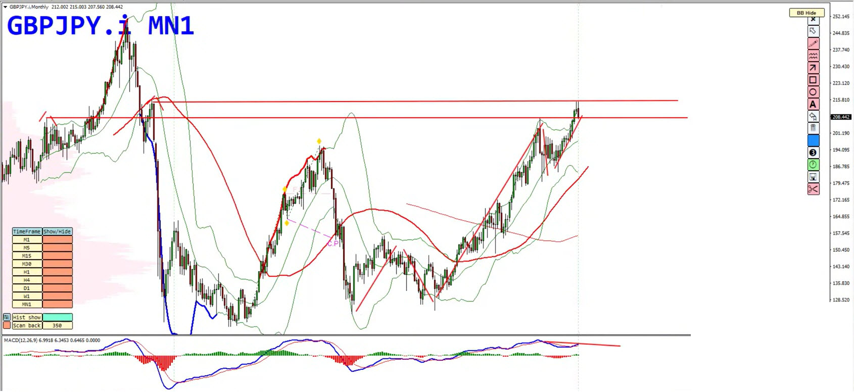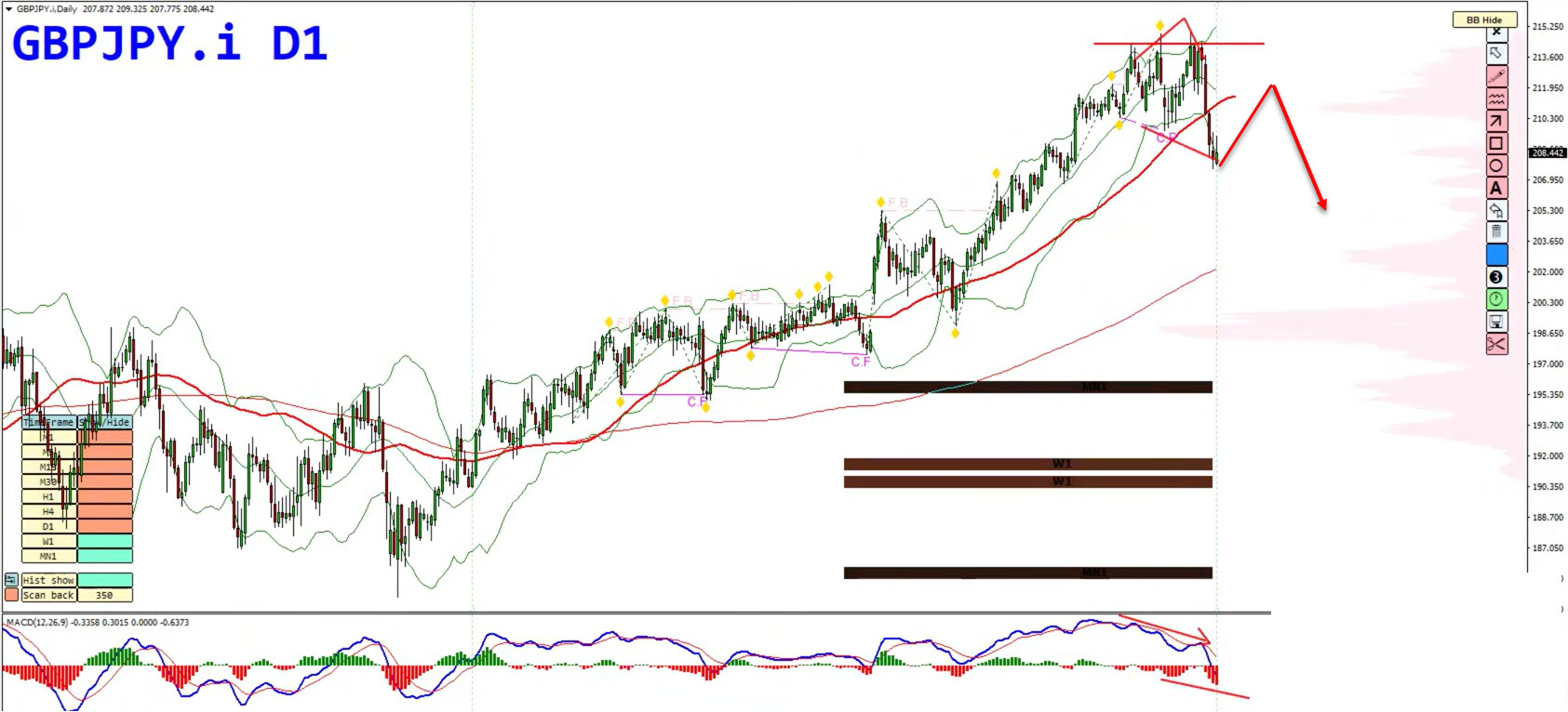 GBP/JPY presents one of the clearest technical setups of the week. The pair has completed a multi-timeframe exhaustion pattern: