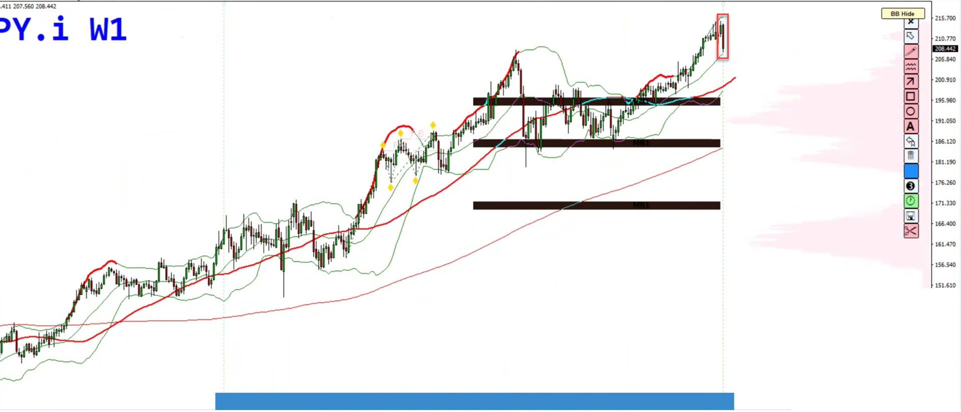 Weekly: Strong bearish engulfing candle after a series of upper wicks – a classic sign of distribution.