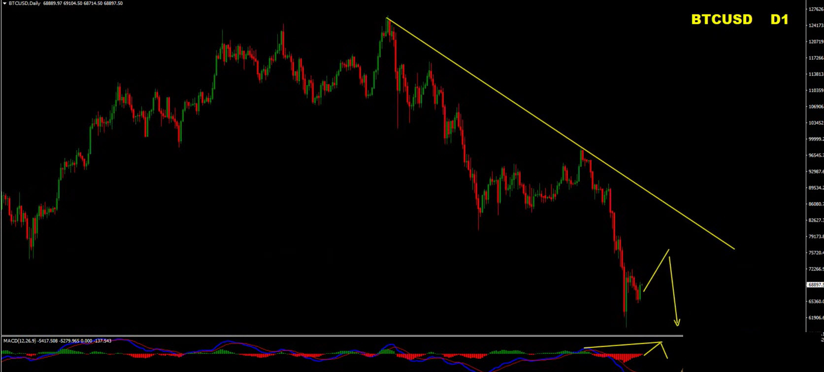 A confirmed break below the daily low with more than one impulsive wave, followed by acceptance below the volume profile support zone, would signal a potential trend shift and open the door for selling rallies.