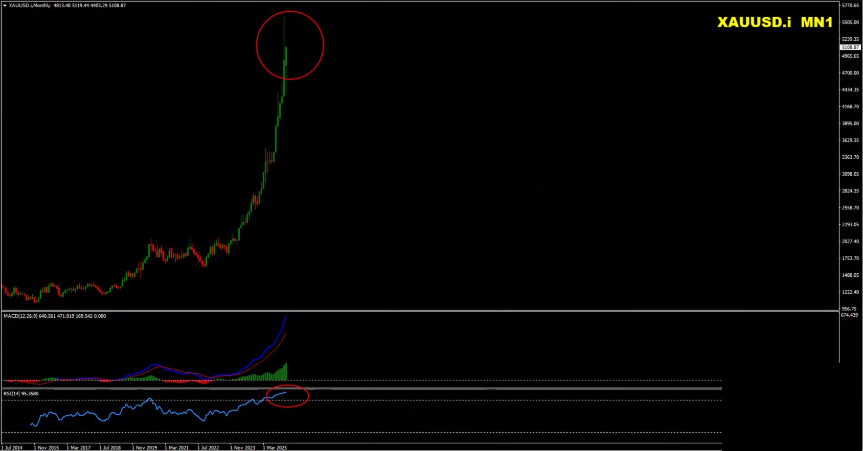 Gold remains near historically overbought conditions on higher timeframes. Despite strong geopolitical risk premiums, the technical picture suggests exhaustion at elevated levels.