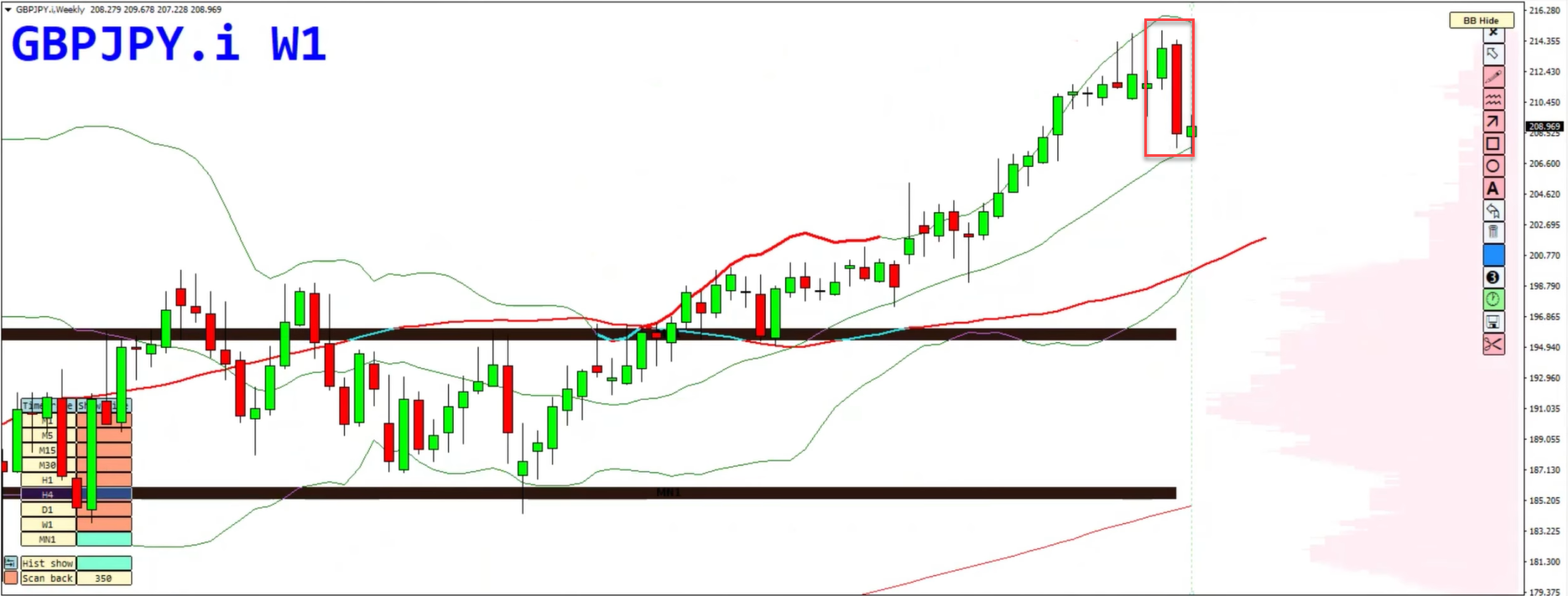 Breakdowns from local consolidation ranges may provide sell opportunities aligned with higher-timeframe overbought conditions.