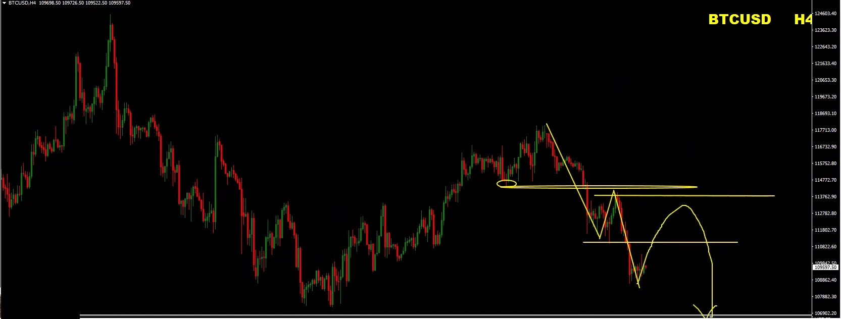 Broken support now acts as resistance around the 113K–114K zone. Every rally into this area faces selling pressure.