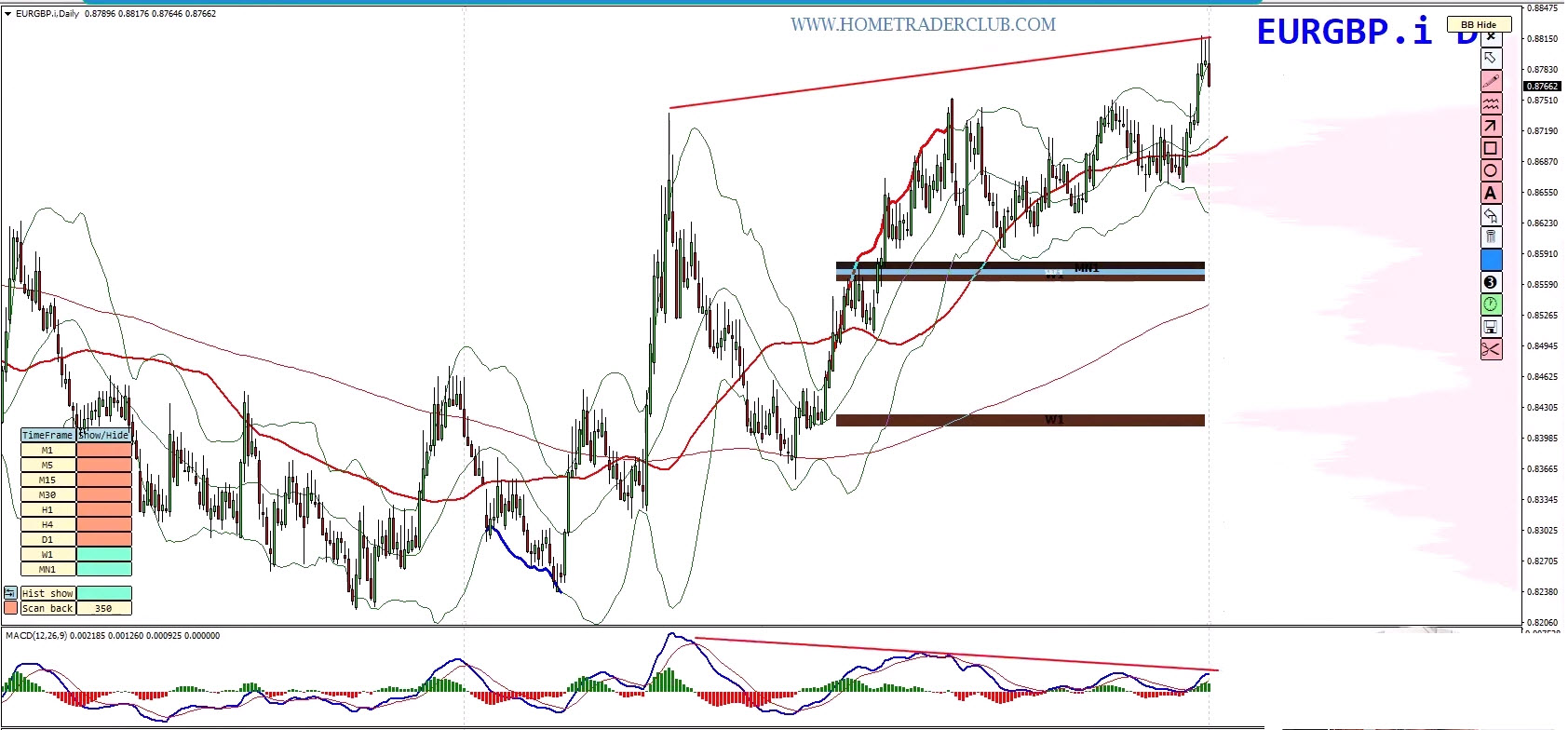 The Euro Pound (EUR/GBP) is currently testing a critical weekly supply zone. On both weekly and daily charts, we see a clear bearish divergence forming — price is making higher highs while MACD forms lower highs.