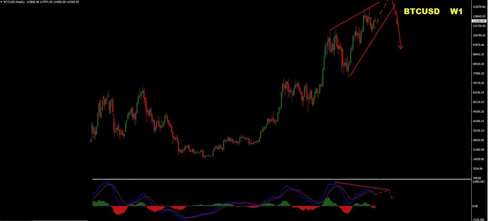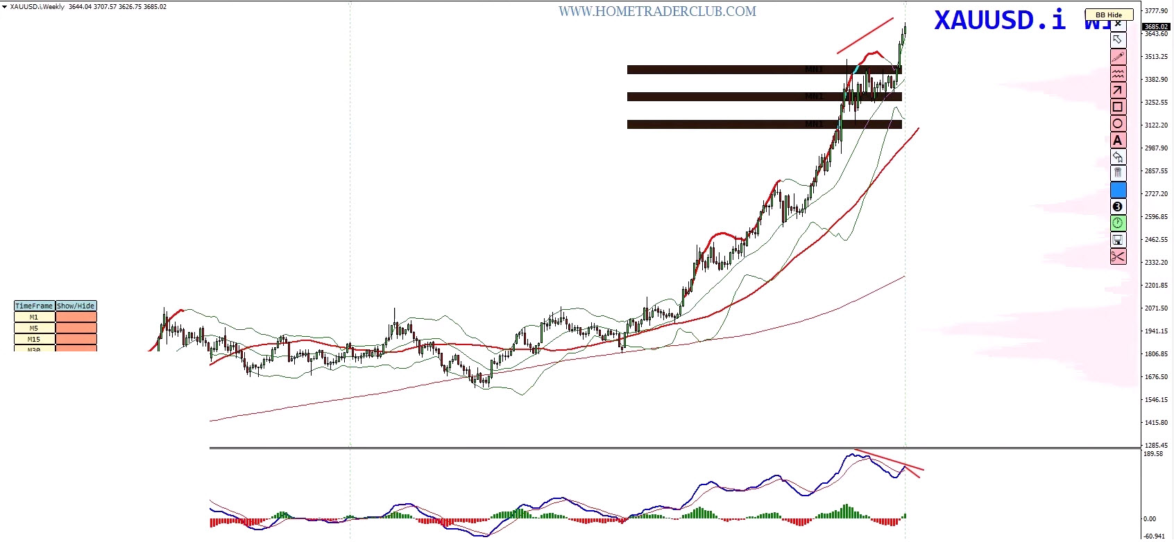Weekly Chart: Price is testing a strong supply zone with more than 20 candles riding the upper Bollinger Band. Similar structures in the past (2020) led to meaningful corrections.