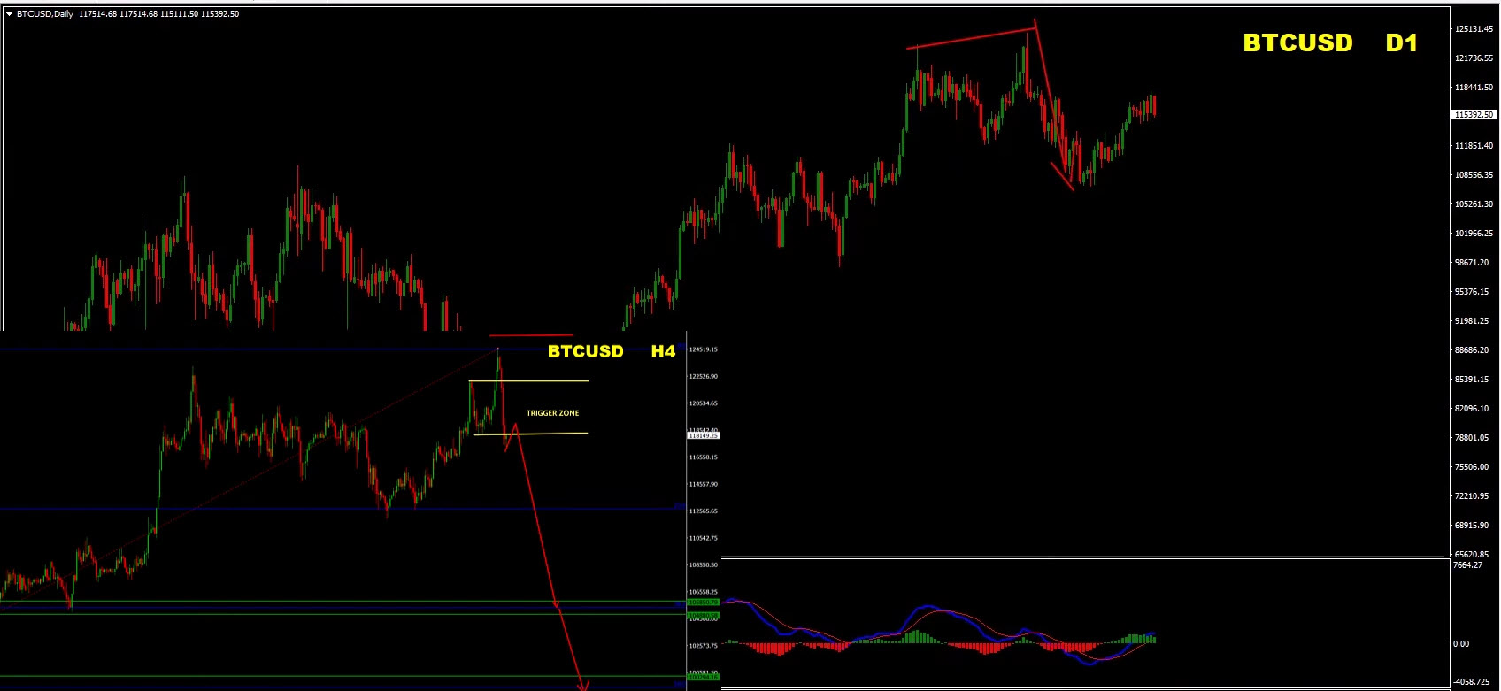 Daily & H4 Charts: Completed a bullish run with bearish divergence, now forming a corrective structure (zigzag pattern).