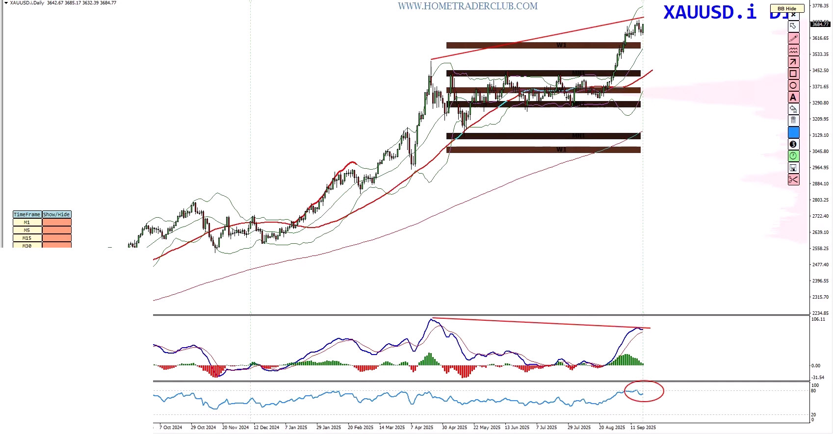 Daily Chart: bearish divergence visible on both MACD and RSI.
