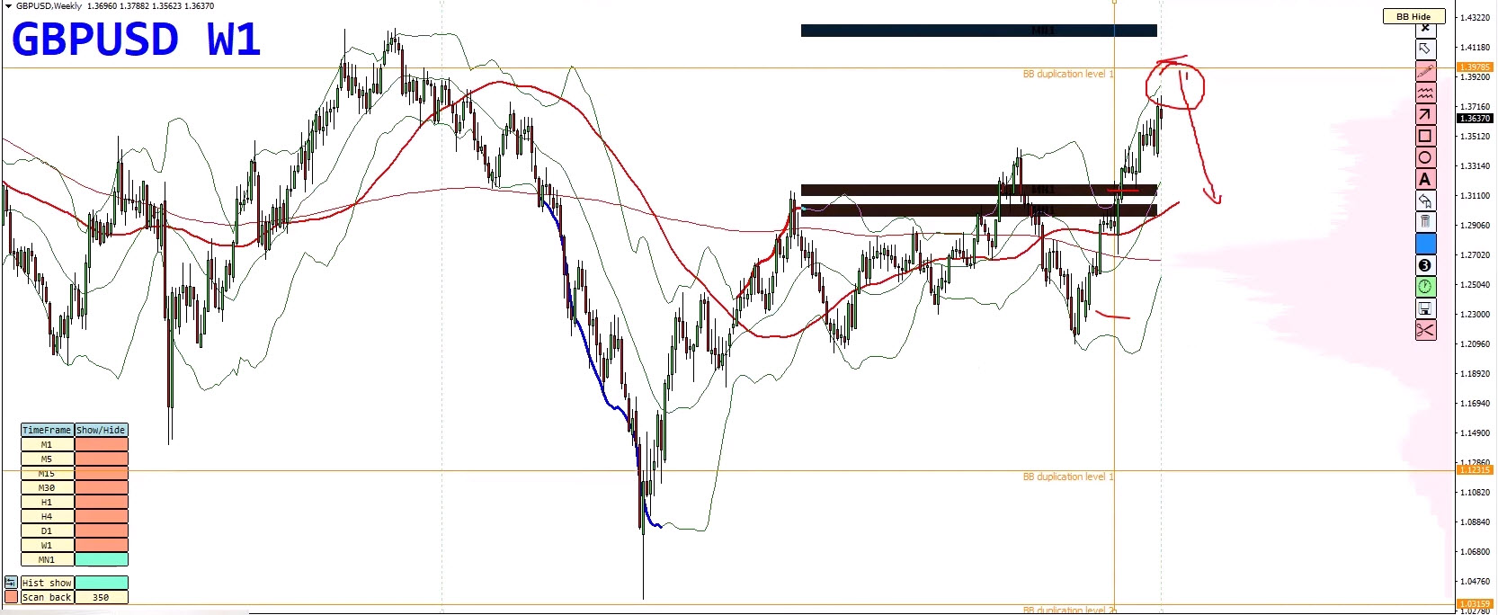- At strong weekly resistance with Bollinger Band duplication pressure.