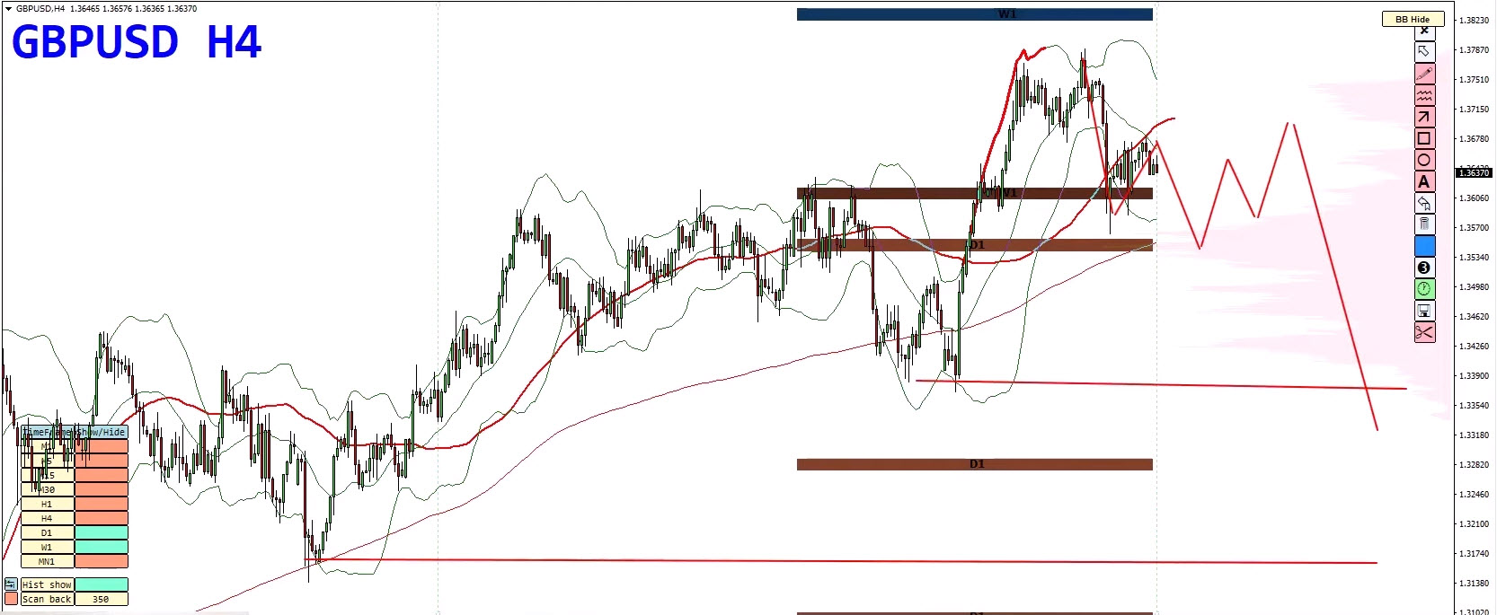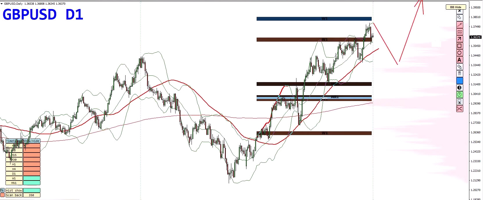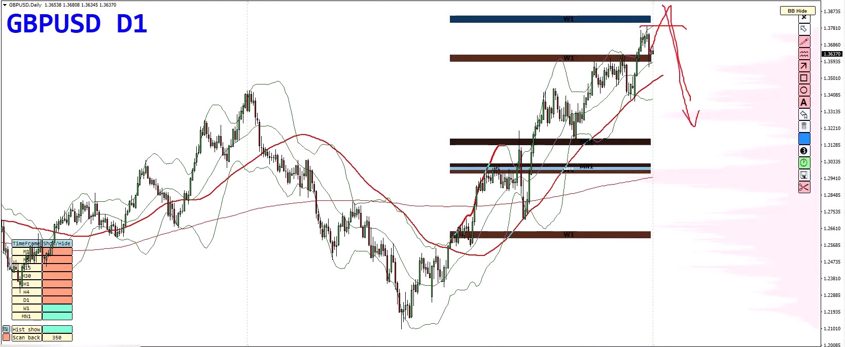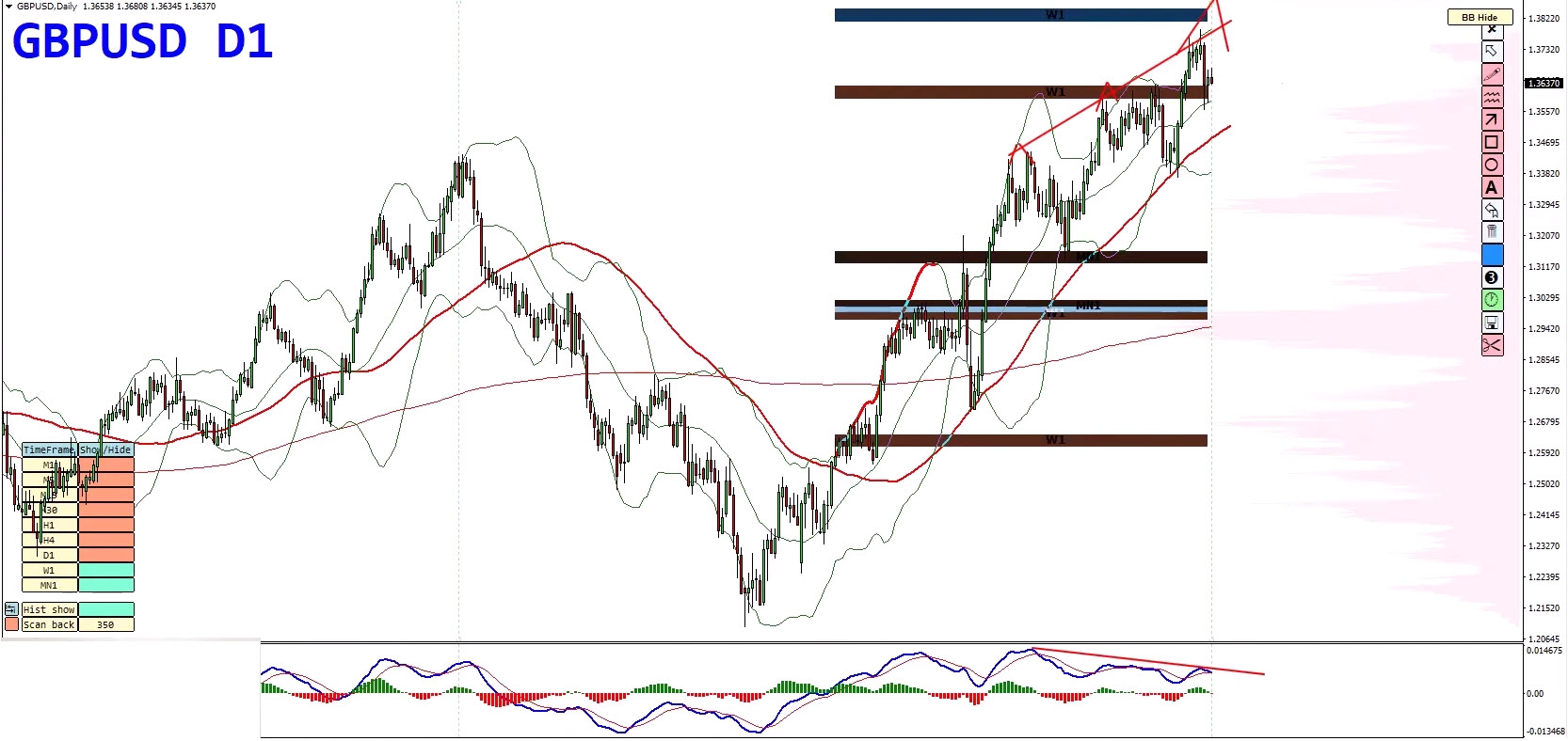 - Daily chart shows a peak with bearish divergence around 1.3750.