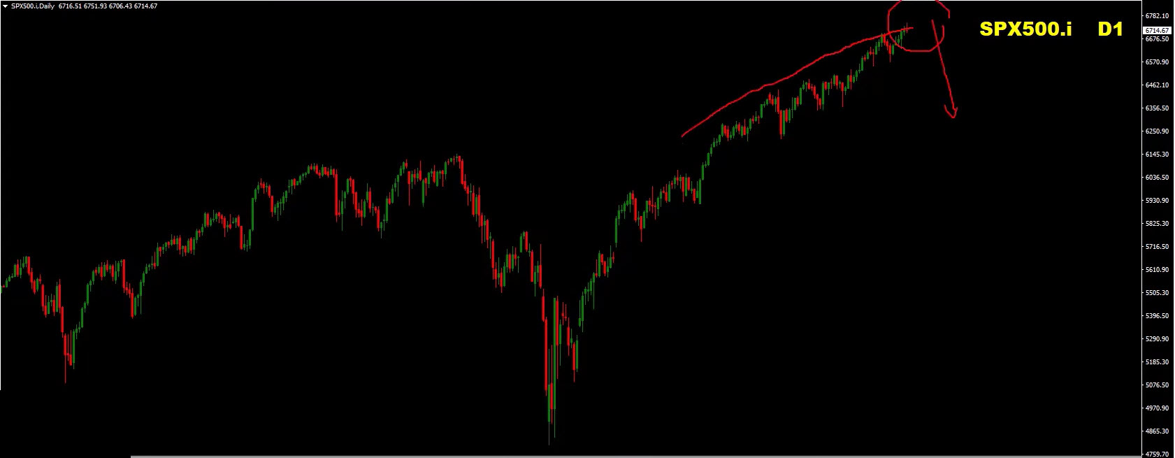 SP500 – Rounding top suggests possible correction; wait for confirmed reversal signals.