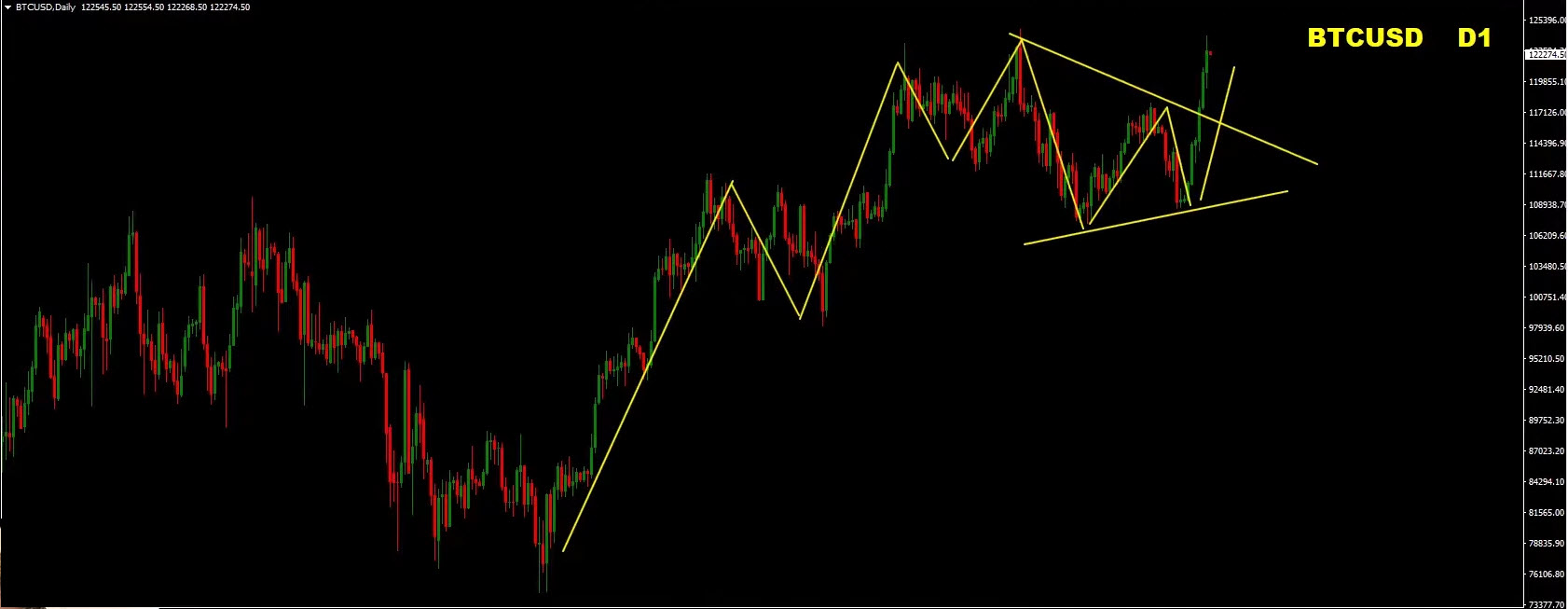 As long as recent lows hold, Bitcoin is likely to continue rallying. Look for retraces back to broken resistance levels turned support—the “money zones”—before the next wave higher. -