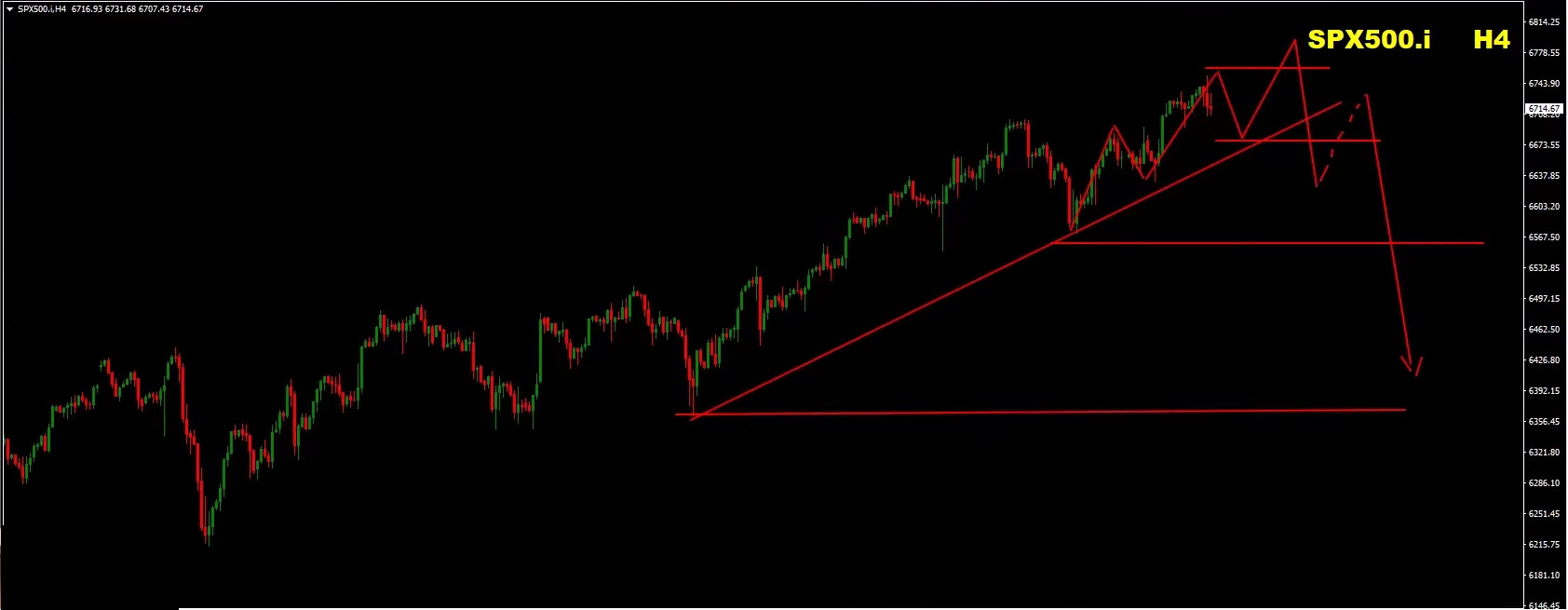 A false breakout followed by a daily and 4H divergence, with a break below the rising trendline, could open the path lower. Key levels to watch are 6,350 → 6,200 → 6,100 (index equivalents for correlation). -