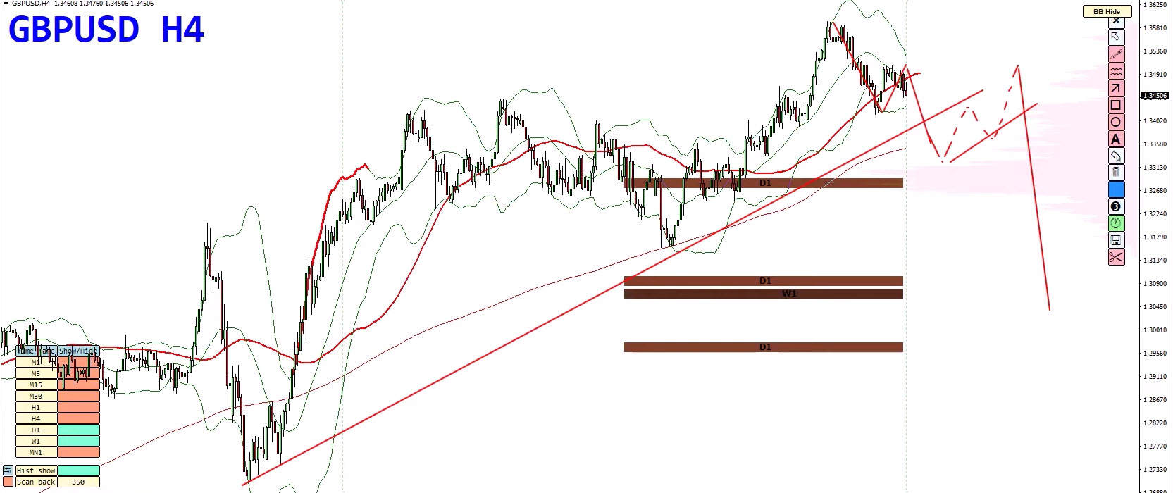 A false breakout, followed by a zigzag corrective structure and breakdown below the trendline, could lead to a deeper correction toward 1.32 or even 1.30.