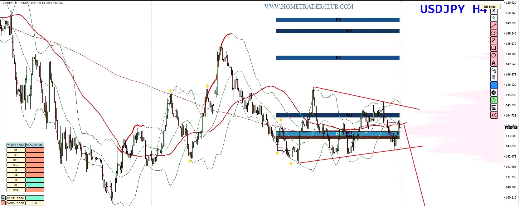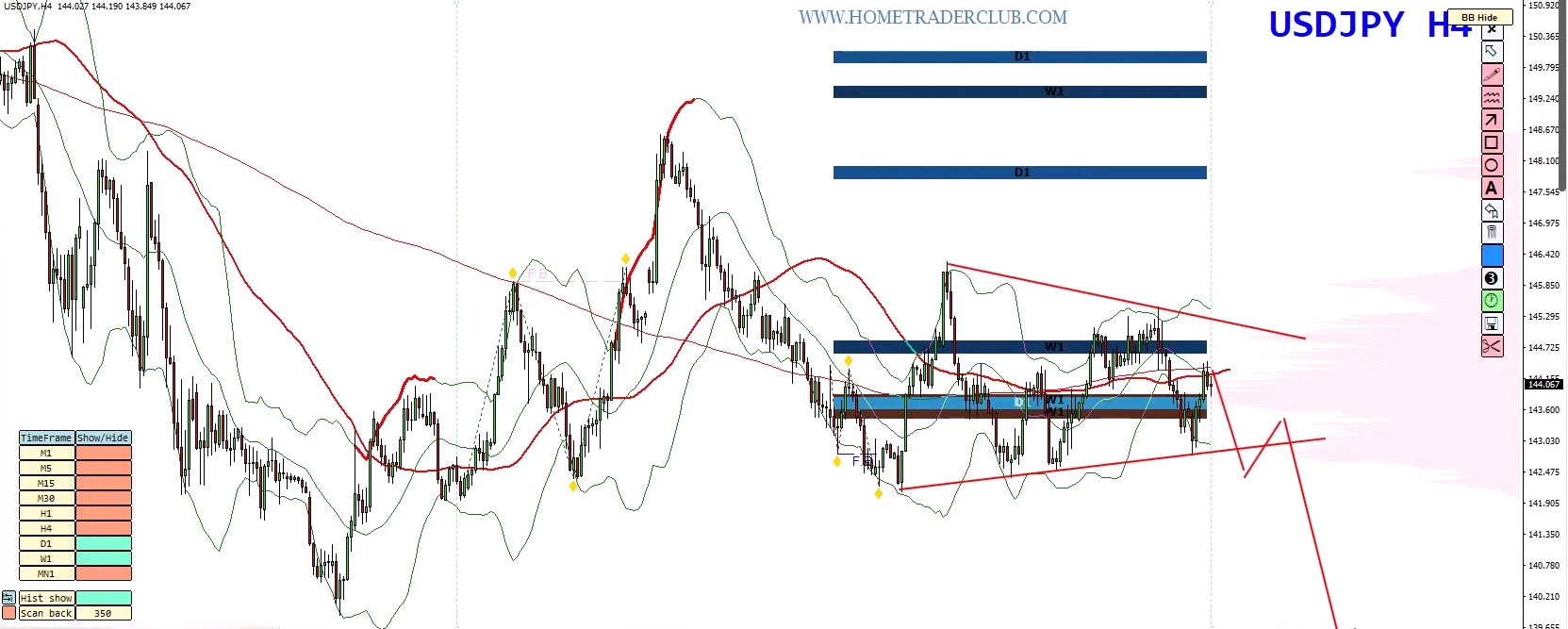 A clean break below the triangle confirms a move toward 1.40 → 1.35
