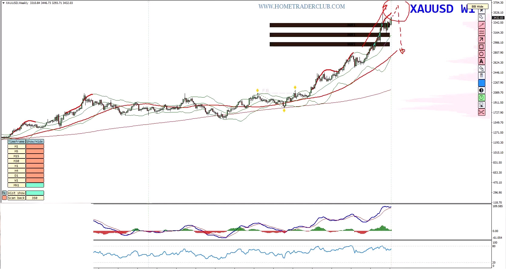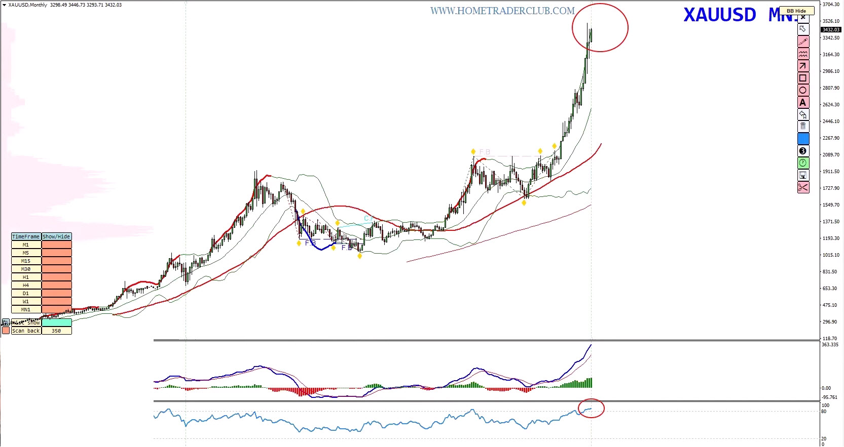Monthly and weekly charts show extreme overbought conditions