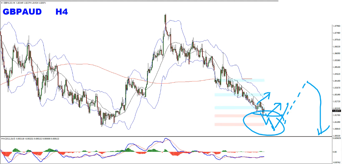 H4– GBPAUD chart highlighting trend line and resistance area and a possible sell scenario.