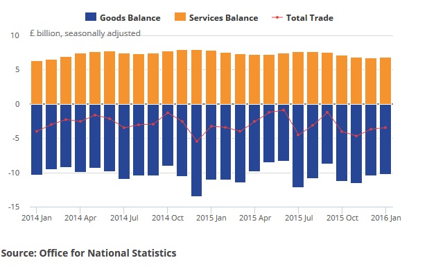 The report stated that UK’s deficit on trade in goods and services was estimated to have been £3.5 billion in January 2016, a narrowing of £0.2 billion from December 2015. The narrowing is attributed to trade in goods where the deficit has narrowed from £10.5 billion in December 2015, to £10.3 billion in January 2016”.