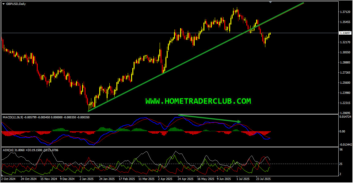 GBPUSD D1(Daily) Chart Analysis – Bearish Divergence, Uptrend Line Breakout, ADX Indicator