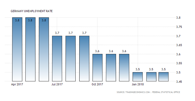 Germany’s Trade Surplus is a Boon for the country’s economy: Germany’s seasonally adjusted harmonised unemployment rate fell to 3.4 percent in March 2018. It was the lowest unemployment rate since July, 1980 because the number of unemployed Germans has been consistently going down as they have been gaining employment.