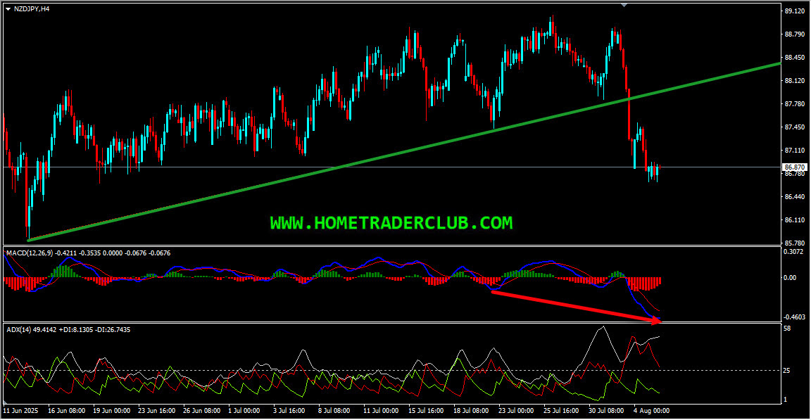 NZDJPY H4(4 Hours) Chart Analysis – Uptrend Line Breakout, Lower Lows, ADX Indicator