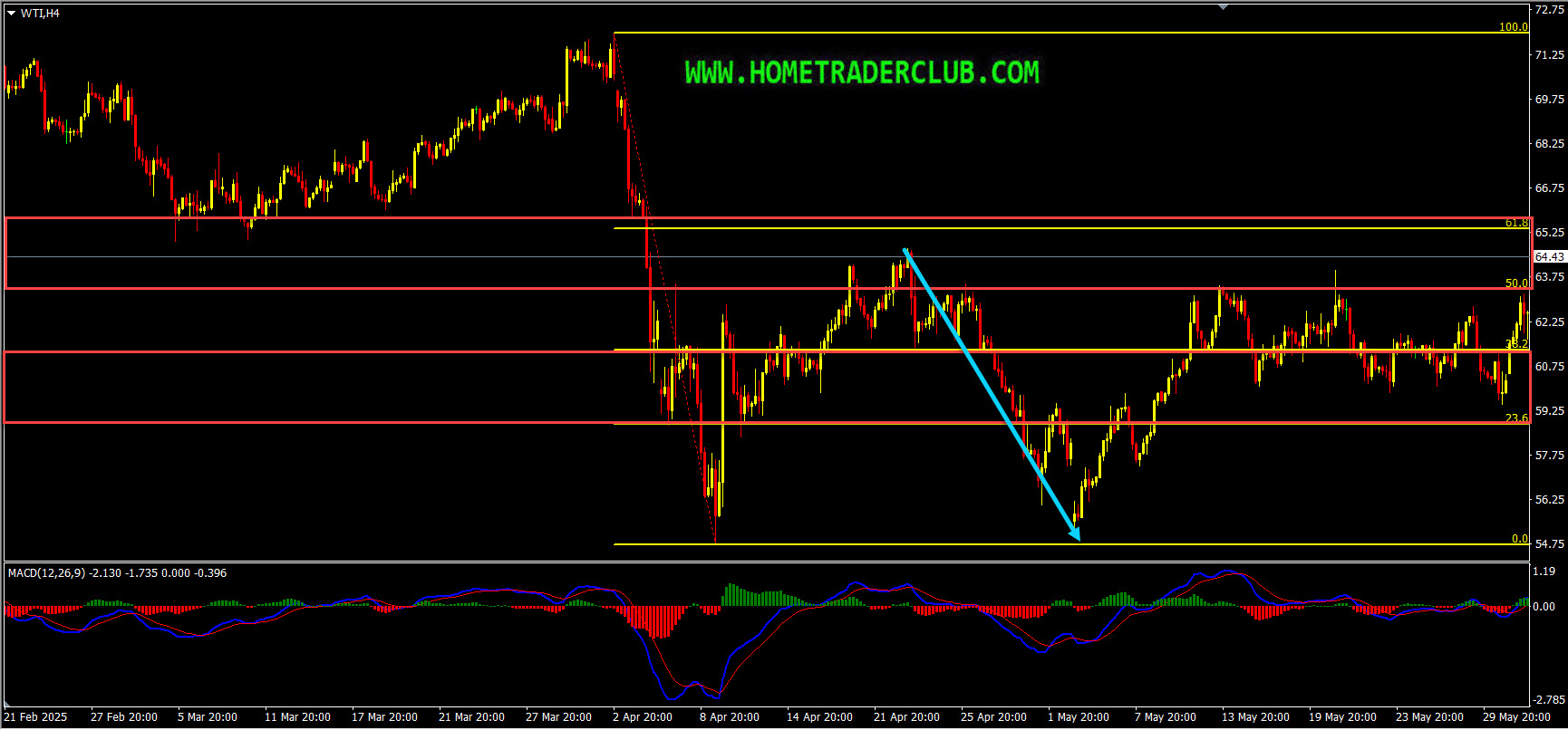 On the H1 chart, the market provided us with various facts supporting the bearish view. The price which was moving higher created a bearish divergence between the first high that has formed at 62.83 and the second high that has formed at 64.70 based on the MACD indicator, which we may consider as evidence of bearish pressure. The price then moved lower and broke below the most recent uptrend line. We may consider these as facts provided by the market supporting the bearish view and also there were no signs opposing this bearish view. Then as you can see in the image below how the price moved lower further and provided a wonderful move to the downside.