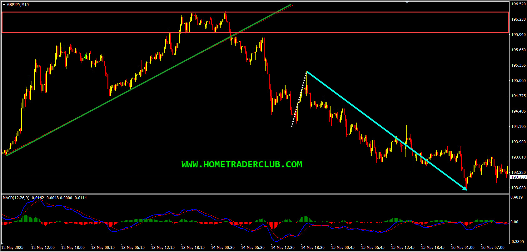 GBPJPY – My idea here was “On the M15 chart, the price which was moving higher created a bearish divergence that has formed between the first high formed at 196.359 and the second high formed at 196.385 based on the MACD indicator which we may consider as evidence of bearish pressure. The price then moved lower and broke below the most recent uptrend line which we may consider as another evidence of bearish pressure. Also, the price which is moving lower has created lower lows based on the MACD indicator which we may consider as yet another evidence of bearish pressure. So everything looks good here for the bears and until the strong resistance zone (marked in red) shown in the image below holds my short term view remains bearish here and I expect the price to move lower further after pullbacks”.