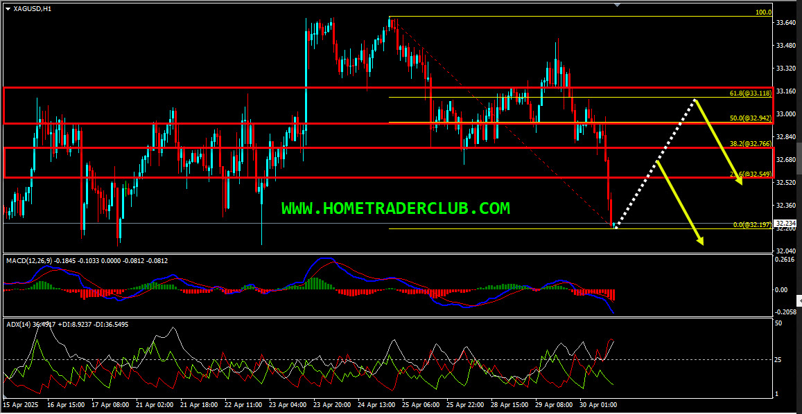 Silver – My idea here was “On the H1 chart, we could see that currently we have a strong bearish momentum here as well. In addition to this, the ADX indicator gave bearish signal here as well at the cross of -DI (red line) versus +DI (green line) and the main signal line (silver line) reads value over 25, we may consider this as yet another evidence of bearish pressure. Also while measuring this strong bearish move we have two key resistance zones that has formed. The first key resistance zone is formed based on the 23.6%(32.549) – 38.2%(32.766) Fibonacci retracement levels of the strong bearish move. The second key resistance zone is formed based on the 50%(32.942) – 61.8%(33.118) Fibonacci retracement levels of the strong bearish move. Until both these key resistance zones shown in the image below (marked in red) holds my short term view remains bearish here and I expect the price to move lower further after pullbacks”.